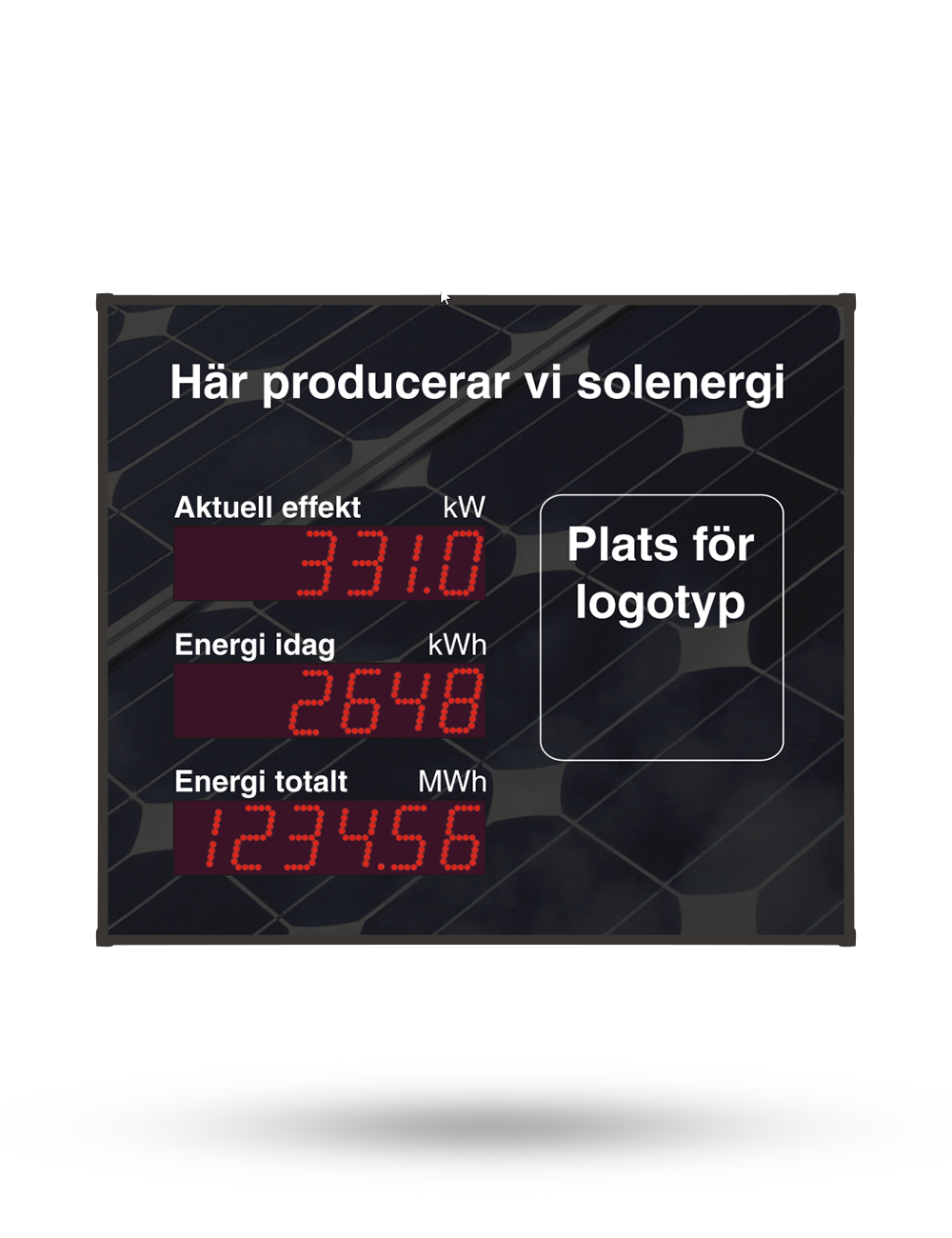 LED-display för inomhus- eller utomhusbruk för visning av produktionsdata från en SolarEdge-anläggning. Displayen visar aktuell effekt (kW), dagens produktion (kWh) och totala produktionen (MWh)
